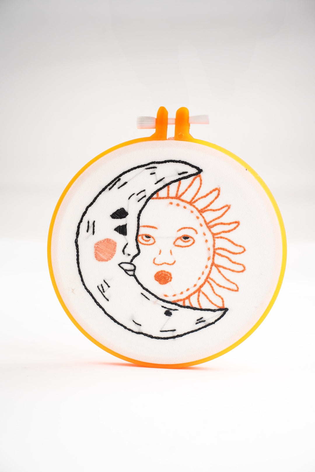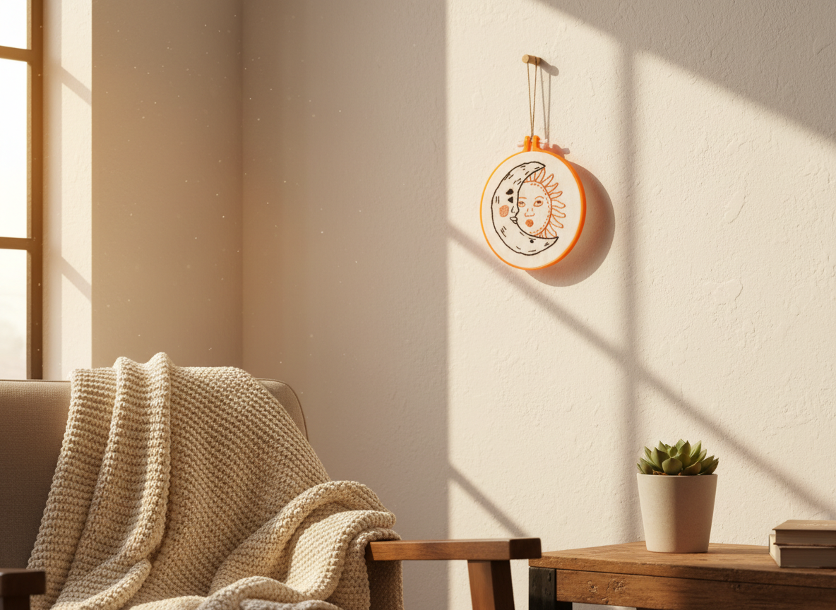 Esta pieza bordada a mano con la representación del sol y la luna, captura la magia del equilibrio cósmico. Hecha con cuidado y detalle, cada puntada evoca la unión de estos dos astros, simbolizando la dualidad entre luz y sombra. La delicadeza del bordado se combina con el toque rústico, creando una pieza decorativa única que aporta un aire de serenidad y misterio.