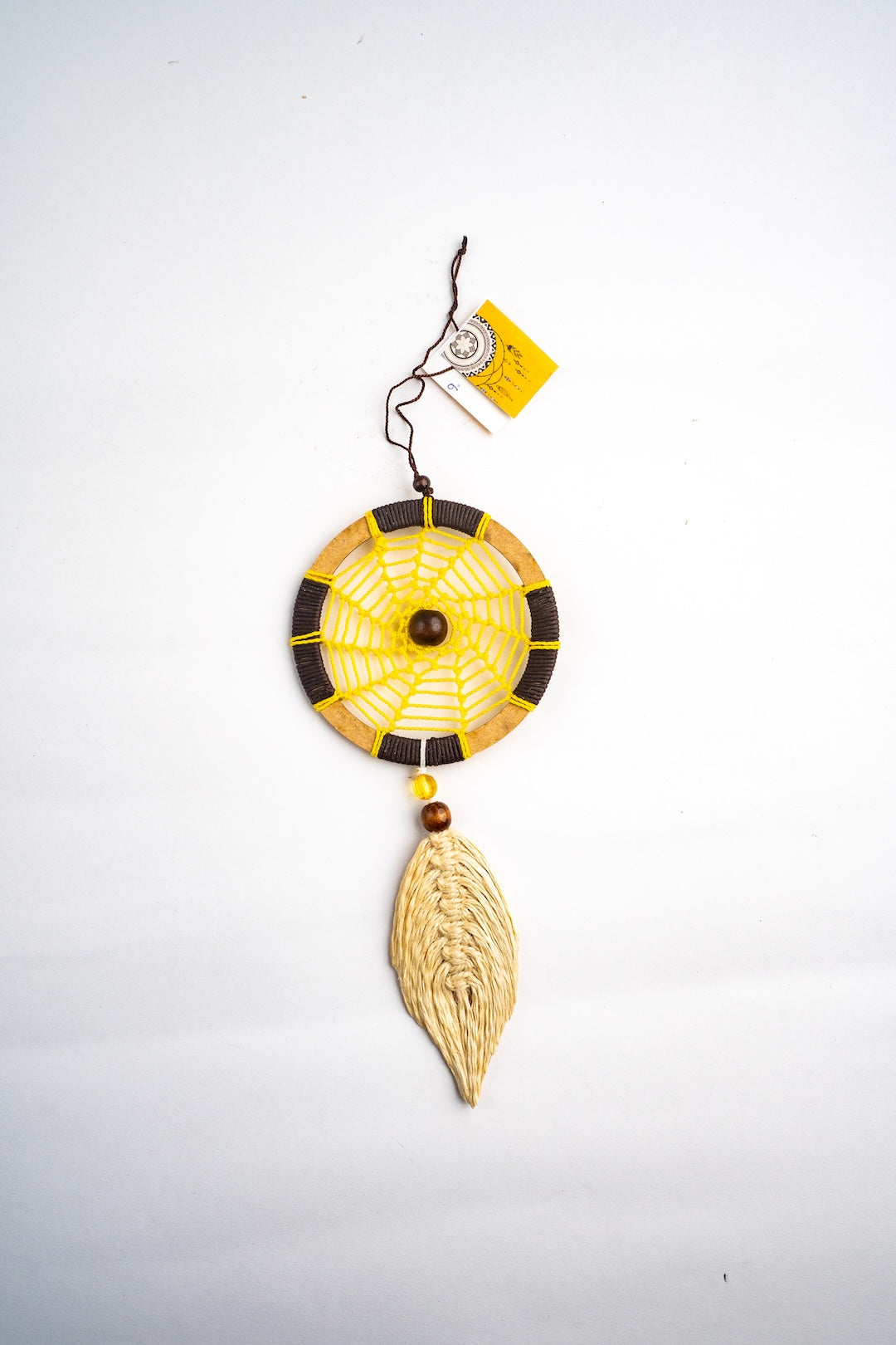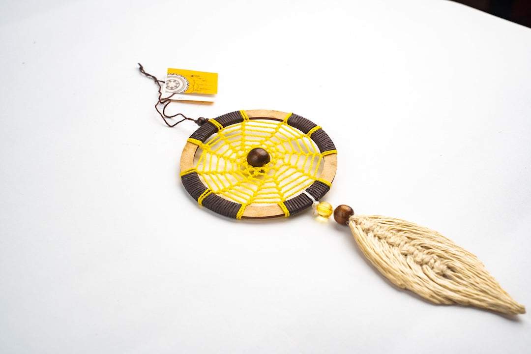 Con un intrincado tejido de hilos marrones y amarillos que simboliza la conexión entre el cielo y la tierra. Las plumas añaden delicadeza. Este atrapasueños es un hermoso decorativo y un amuleto que invita a soñar. Perfecto para regalar o disfrutar en casa, ofrece un toque de magia y simbolismo.