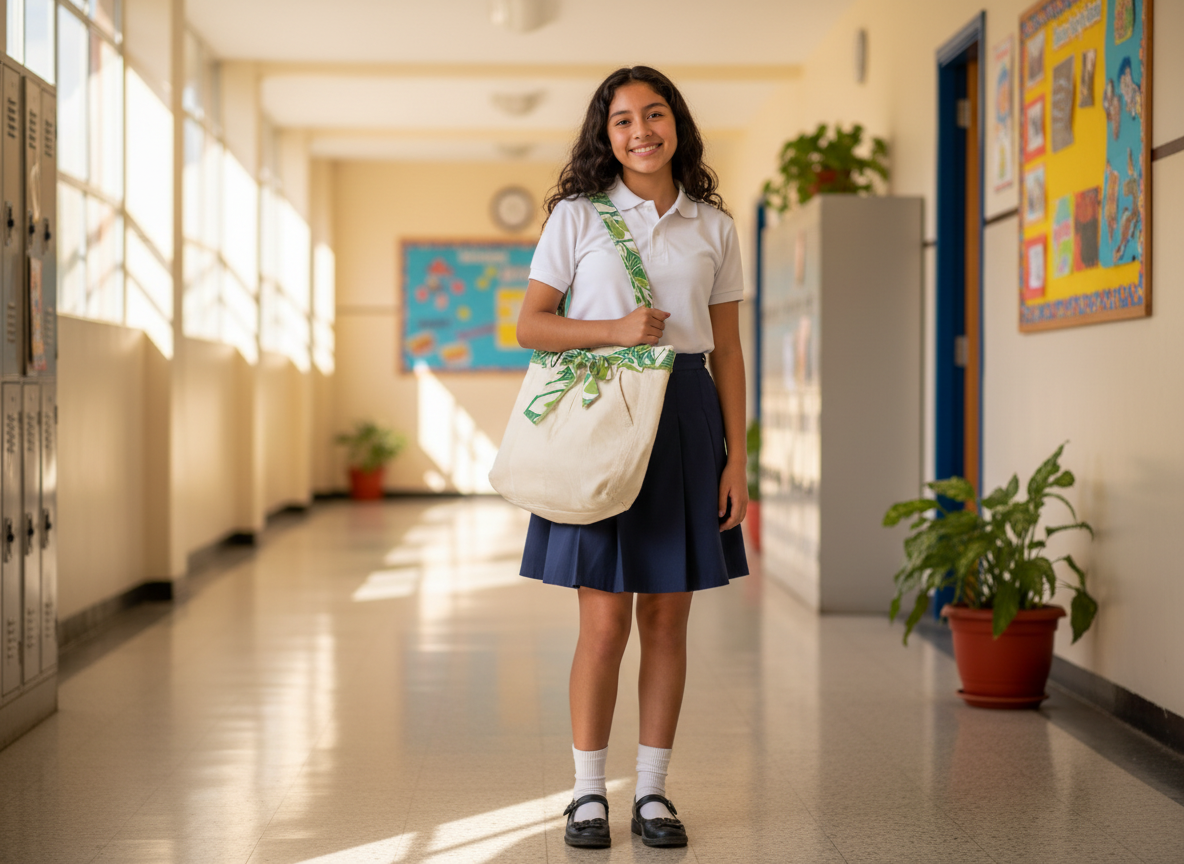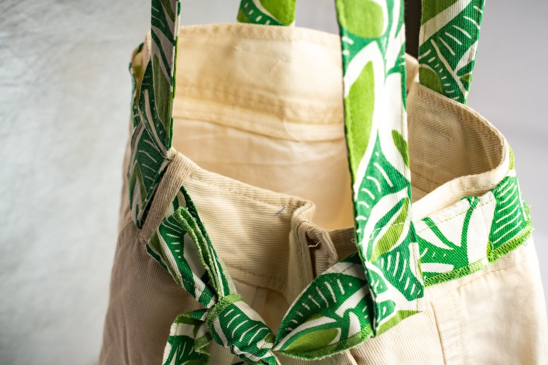 Bolso único confeccionado a partir de un pantalón reciclado en tono crema, con un elegante detalle verde que aporta un toque de originalidad. Sostenible y estiloso, ideal para quienes buscan una opción ecoamigable sin sacrificar el diseño.