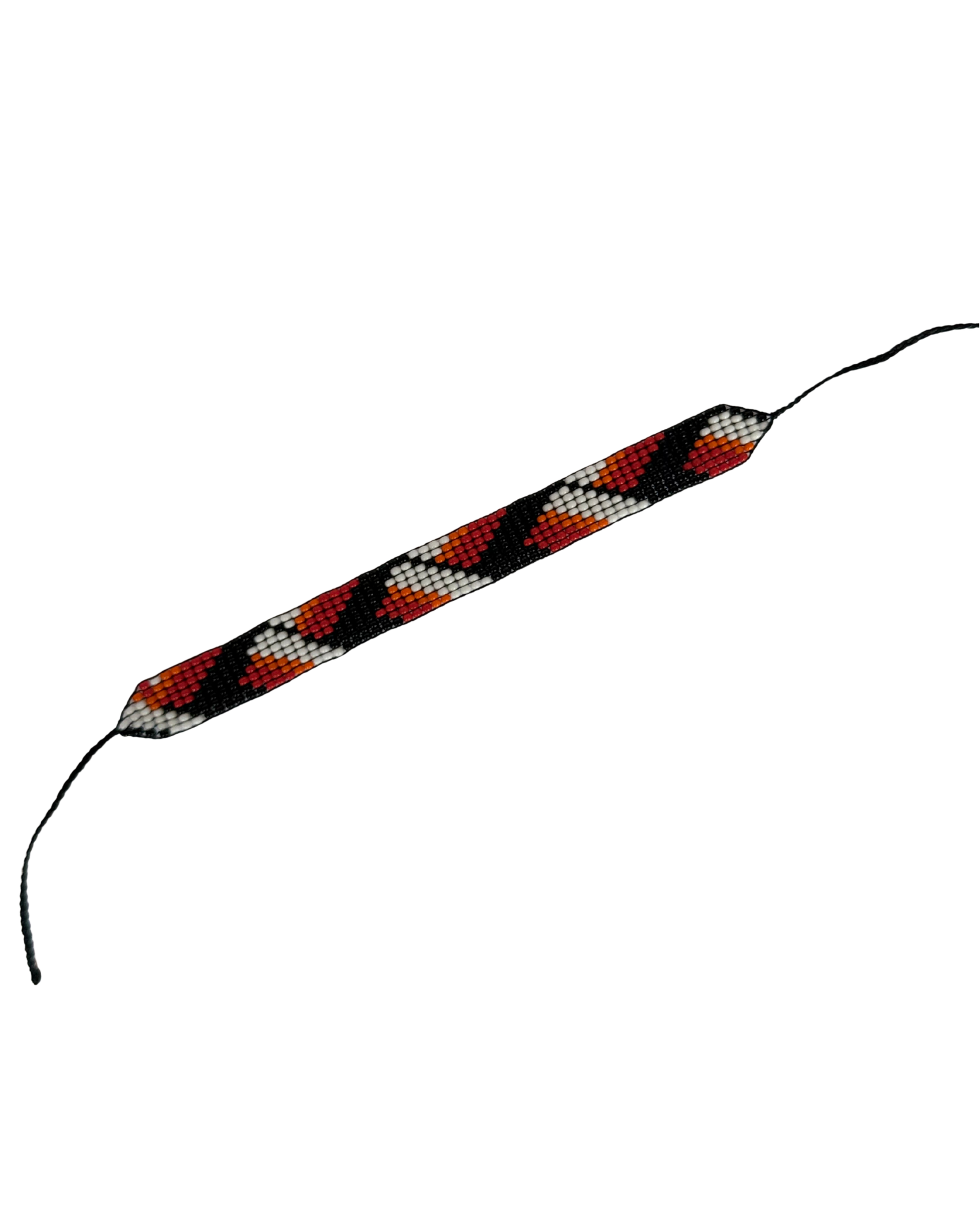 Brazalete Colores en Triángulos – Tejido 100% a mano en mostacilla de chaquira, con figuras geométricas en negro, blanco, rojo y naranja. Creación artesanal de mujeres emprendedoras amazónicas, ideal como detalle original o accesorio con identidad cultural.