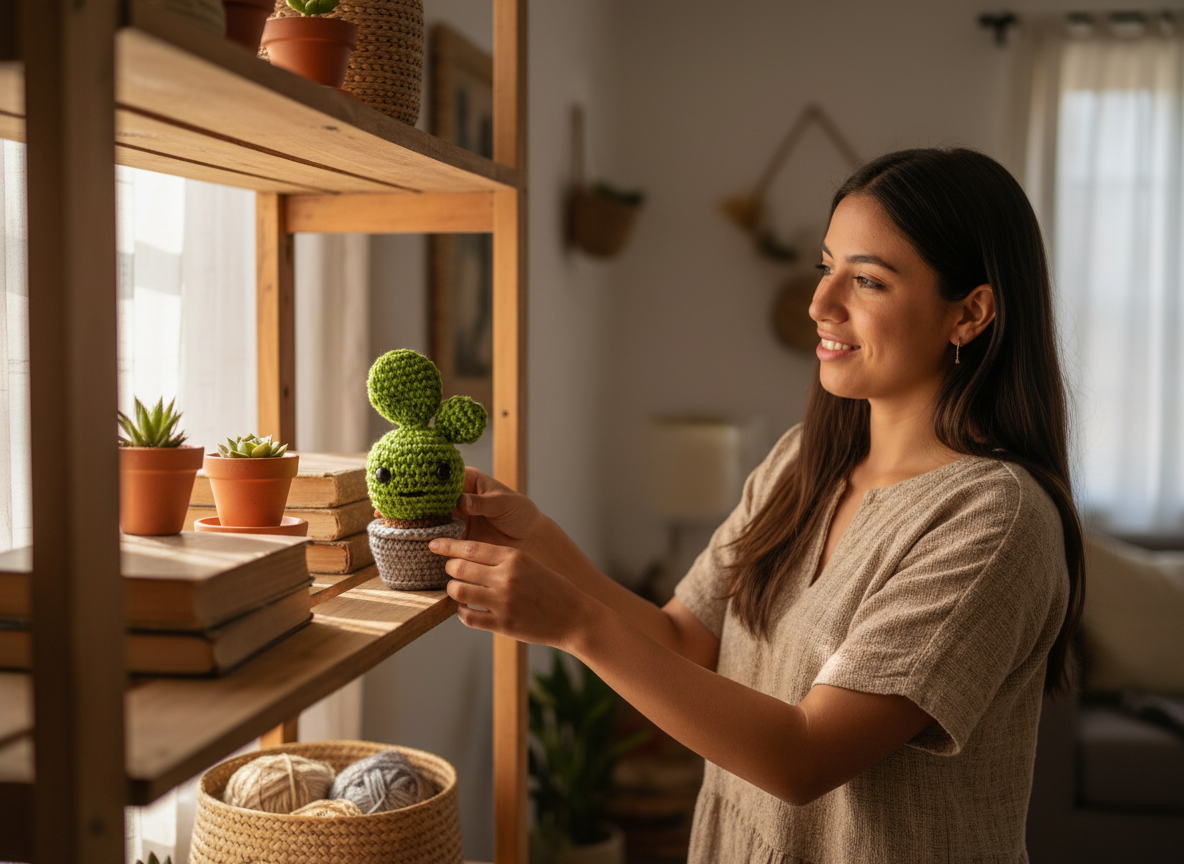 Amigurumi Cactus Pepe – Alegre y decorativo cactus de 13 cm, tejido y bordado a mano en punto bajo con hilos de algodón y acrílico. Relleno de plumón y presentado en vaso de plástico reciclado en verde oscuro, es una pieza artesanal creada por mujeres emprendedoras amazónicas, perfecta como regalo o detalle único. 🌵💚