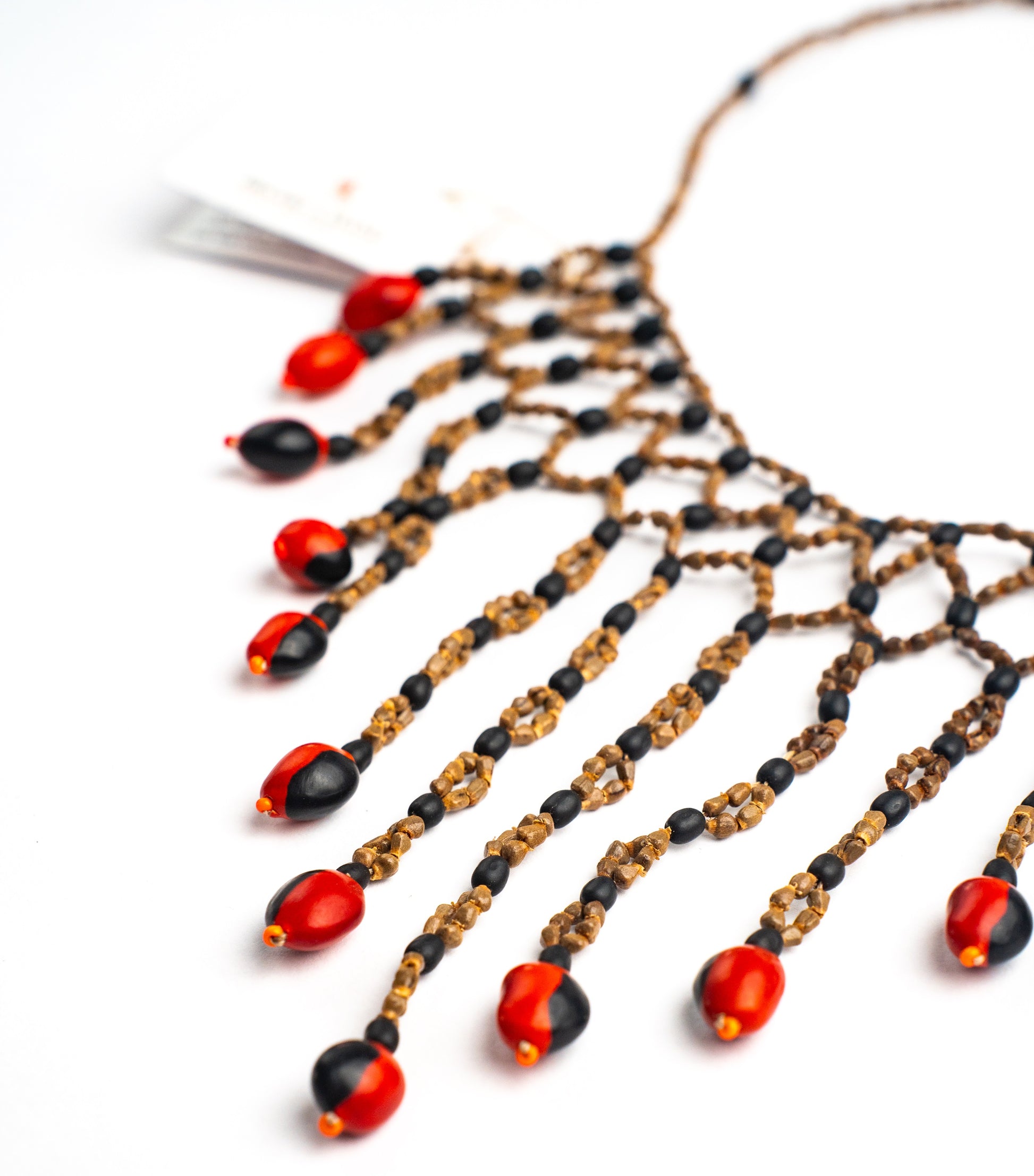 El collar pechera es una pieza artística que destaca por su diseño en forma de punta y su conexión con la naturaleza. Utiliza tres tipos de semillas: el huayruro rojo aporta energía, la semilla shiwango en café claro añade calidez, y la achira en café oscuro aporta sofisticación. Juntas, crean una armonía de colores y cuentan una historia de tradición y conexión con la tierra, celebrando la riqueza de los materiales naturales.