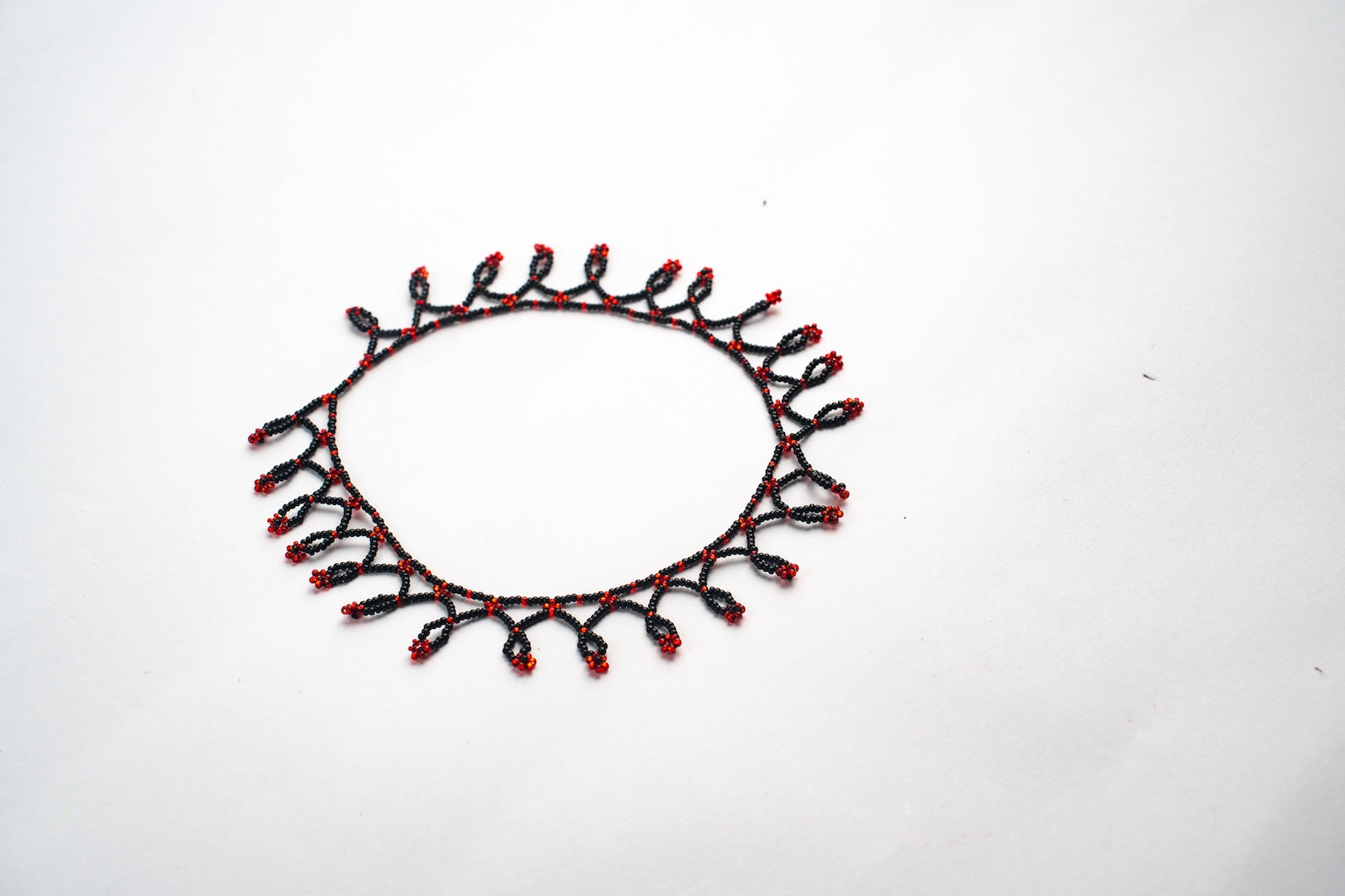 Su base negra resalta las pepitas rojas vibrantes, creando un contraste impresionante. Es ideal para ocasiones especiales o para agregar un toque distintivo a atuendos diarios, combinando con estilos clásicos y modernos. Su diseño sofisticado y audaz lo convierte en un accesorio imprescindible para quienes desean destacar.