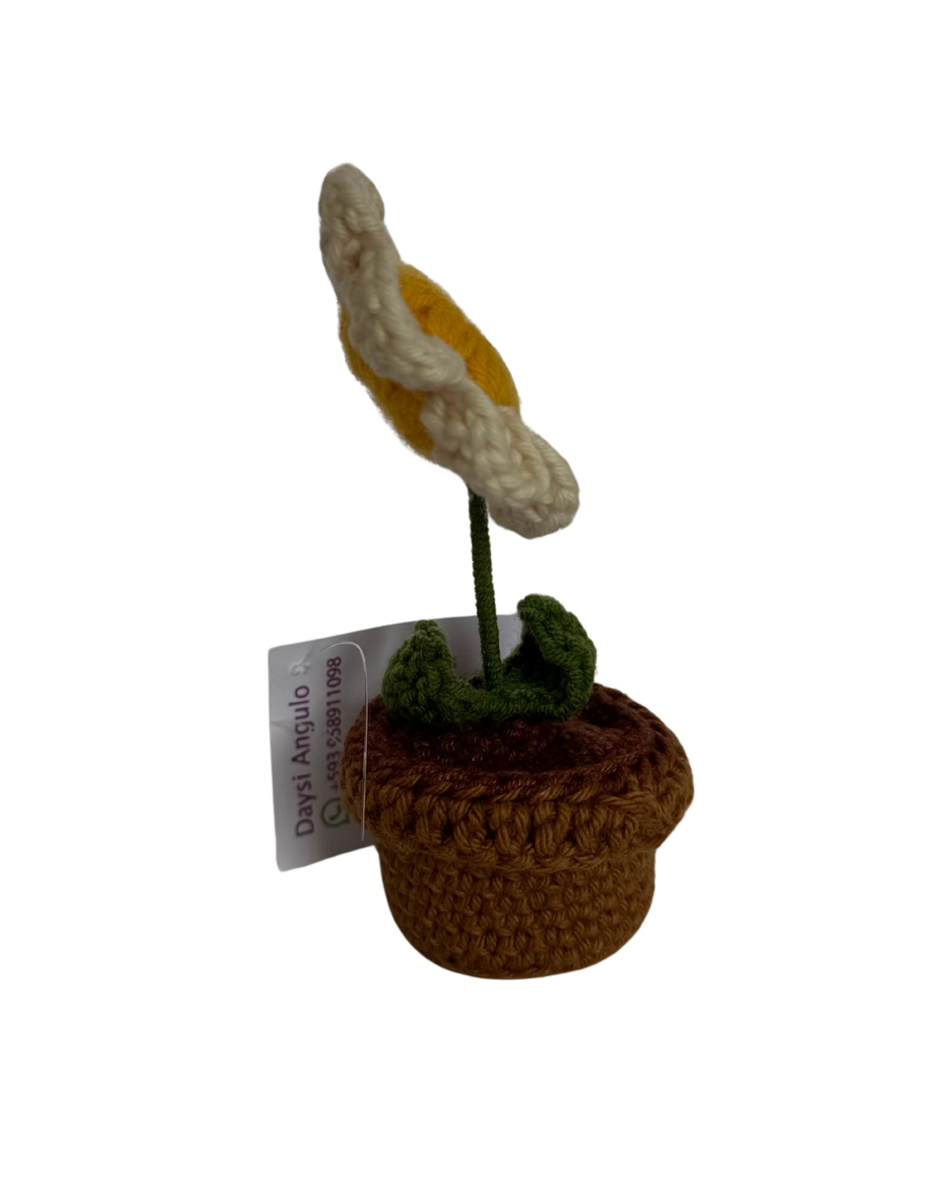 Amigurumi Flor, Alegría de mis Ojos – Hermosa creación tejida y bordada a mano en punto bajo y alto, con hilos de algodón y estructura de alambre. Presentada en vaso reciclado, es una pieza artesanal elaborada por mujeres emprendedoras amazónicas, ideal para regalar o dar vida a cualquier espacio. 🌸💚