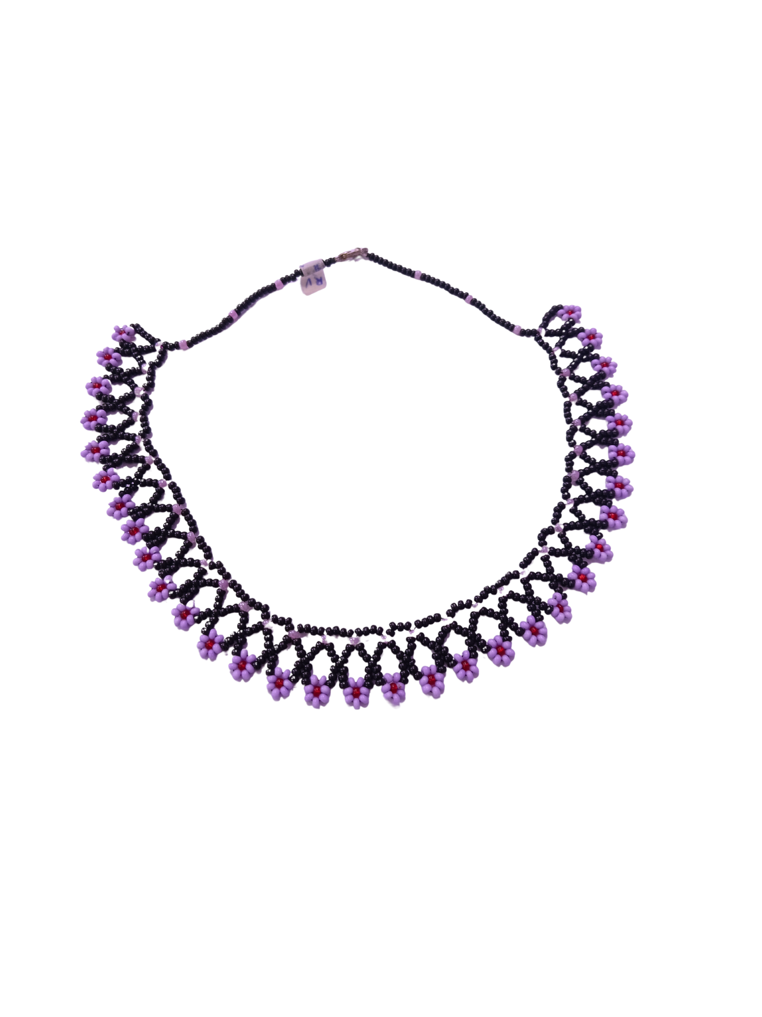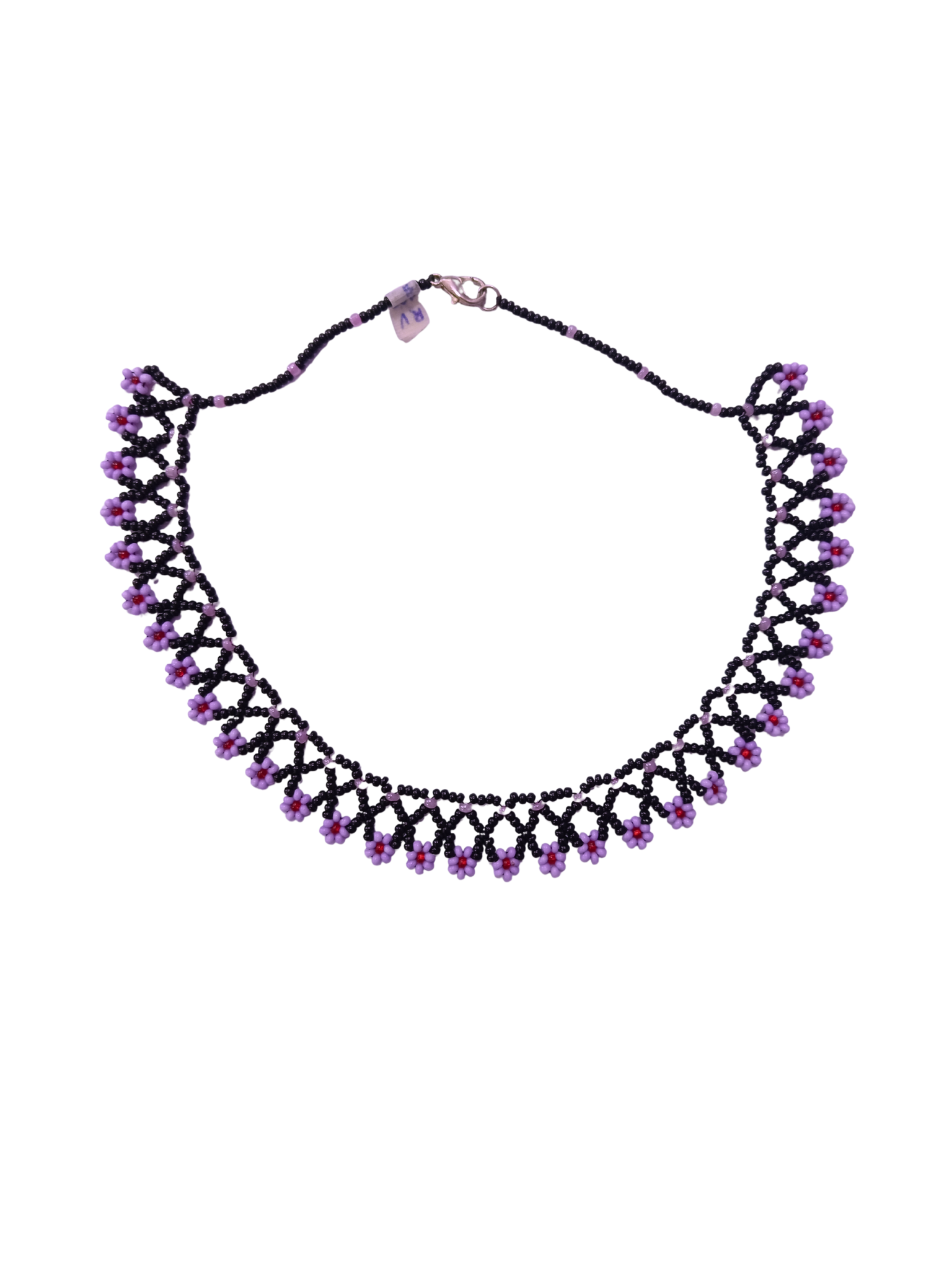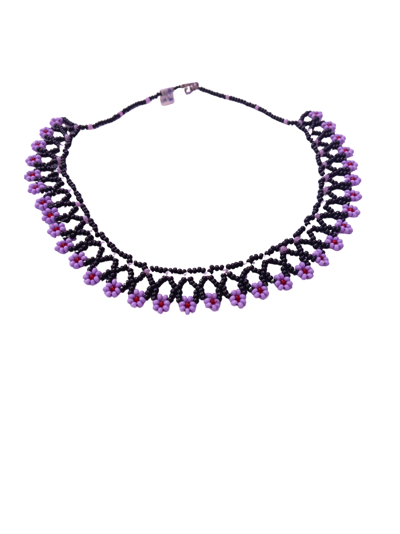 Collar delicado elaborado a mano, adornado con motivos florales en tonos morados que evocan serenidad, calma y equilibrio. Su diseño sutil y elegante lo convierte en una pieza ideal para quienes buscan un accesorio artesanal que transmita suavidad y conexión emocional.