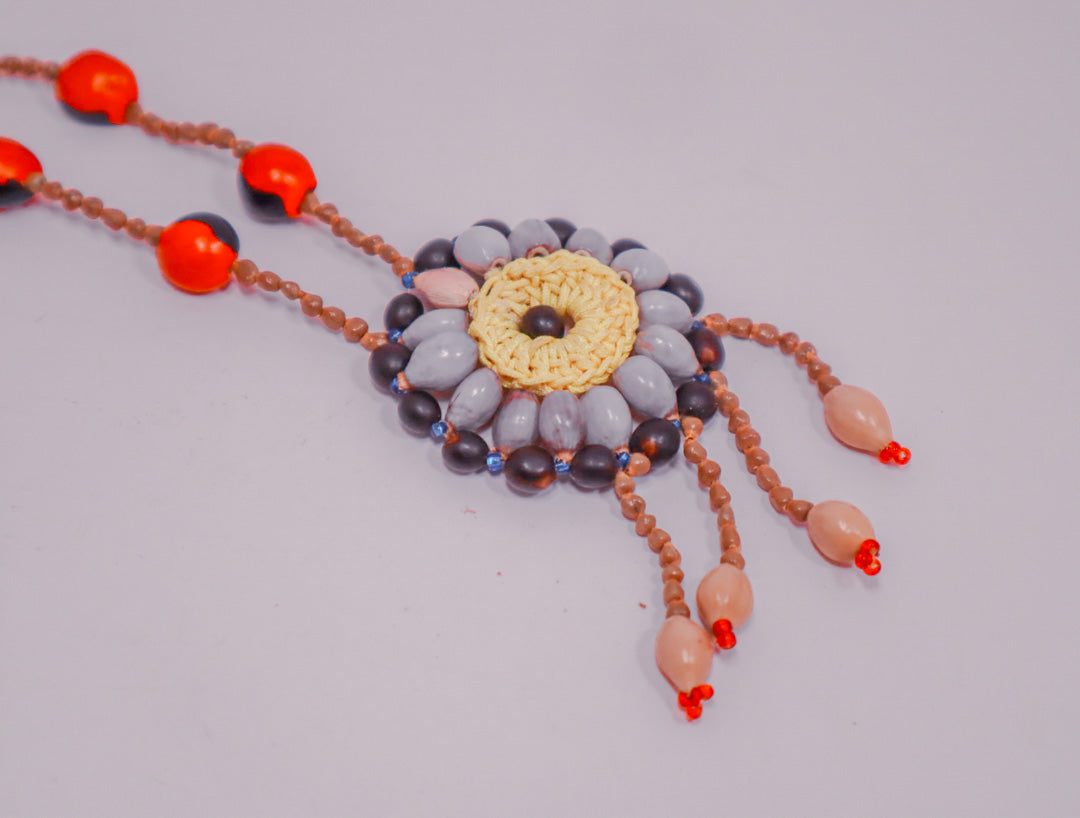 Collar artesanal que culmina en un amuleto en forma de flor, cuyas tonalidades grises con bordes negros evocan la dualidad entre la sombra y la luz. En su centro, un hilo amarillo resplandece como el sol interior, rodeando una pepa negra que representa la semilla del alma. Este diseño transmite equilibrio, protección y conexión profunda con los ciclos de la vida.