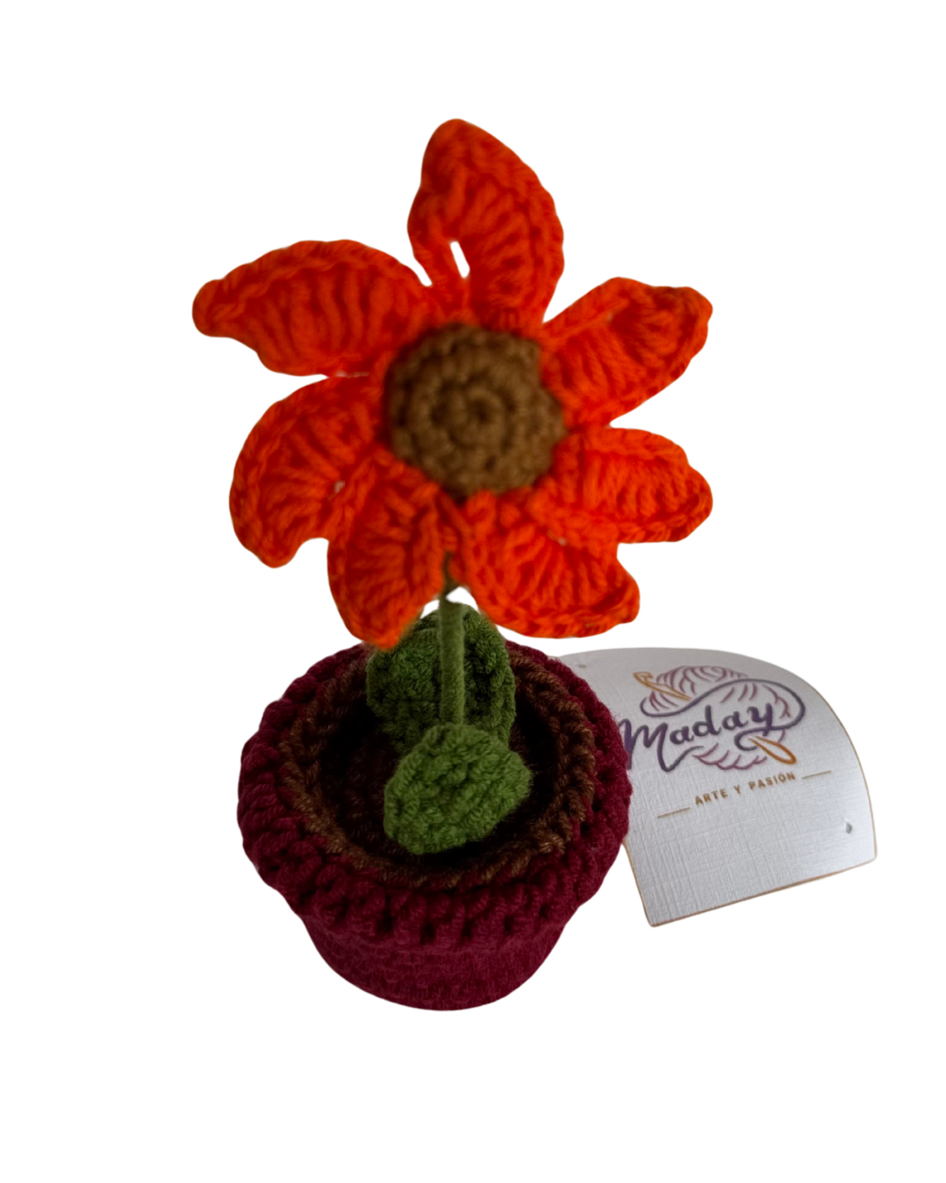 Amigurumi Flor, Iris– Hermosa creación tejida y bordada a mano en punto bajo y alto, con hilos de algodón y estructura de alambre. Presentada en vaso reciclado, es una pieza artesanal elaborada por mujeres emprendedoras amazónicas, ideal para regalar o dar vida a cualquier espacio. 🌸💚