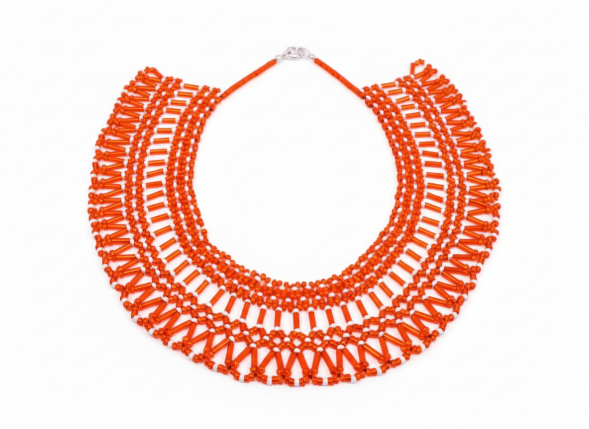 Collar vibrante de tonos rojos intensos, elaborado con pepas rojas entrelazadas. Las pepas horizontales alargadas forman un diseño dinámico que recuerda las llamas del fuego. Representa pasión, conexión espiritual y protección.