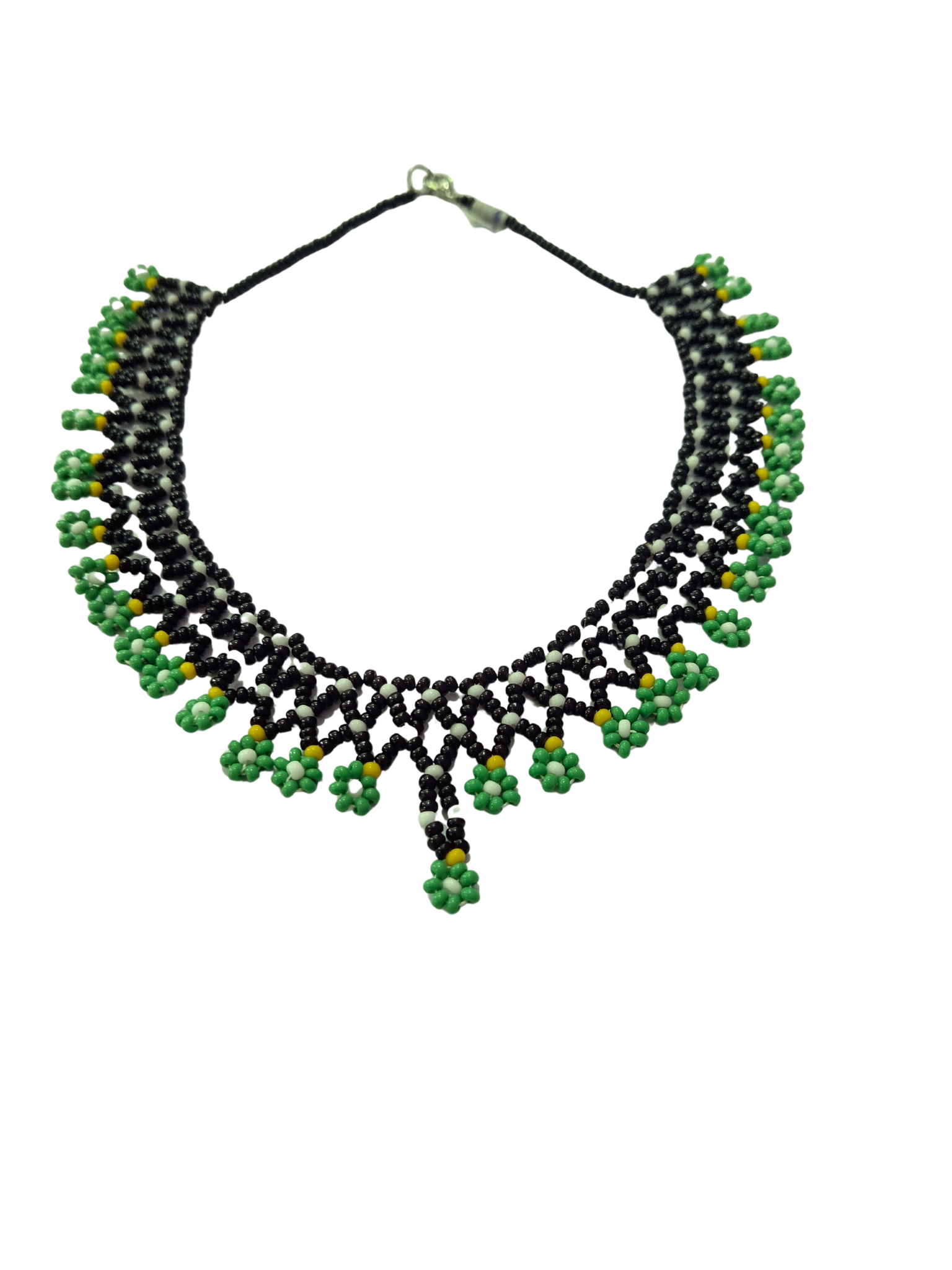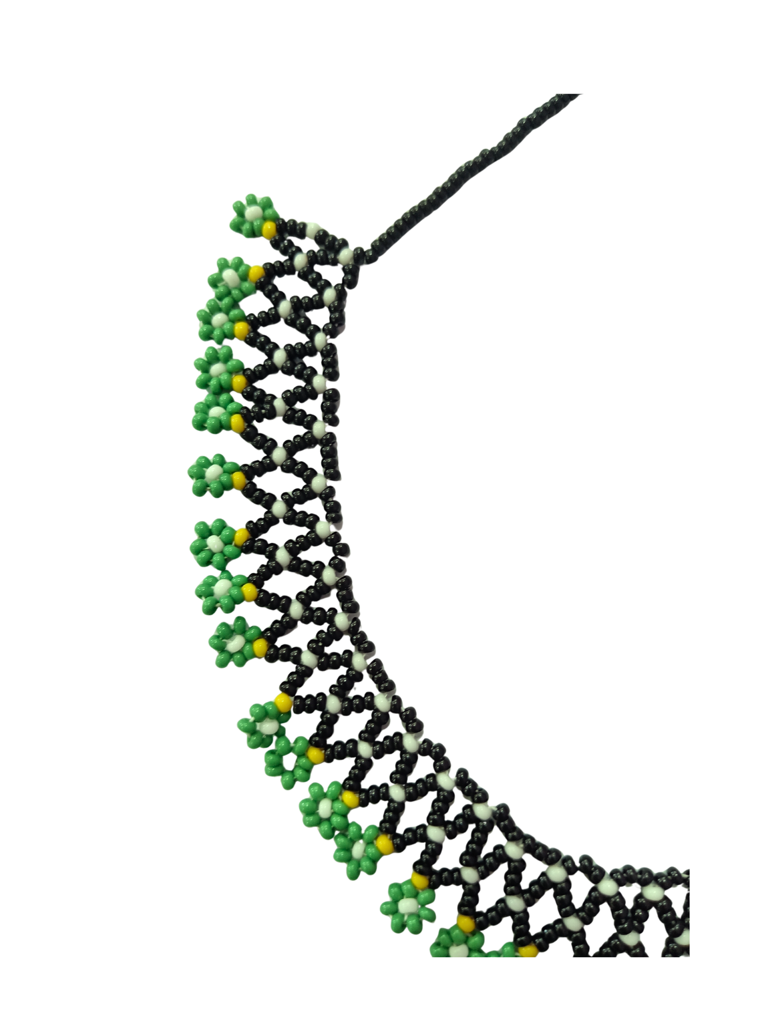 Collar artesanal elaborado en chaquira, inspirado en las flores que florecen en la noche, símbolo de misterio, renovación y belleza silenciosa. El contraste del verde con el negro representa la vida, la armonía y el equilibrio con la naturaleza, creando una pieza profunda y llena de significado.