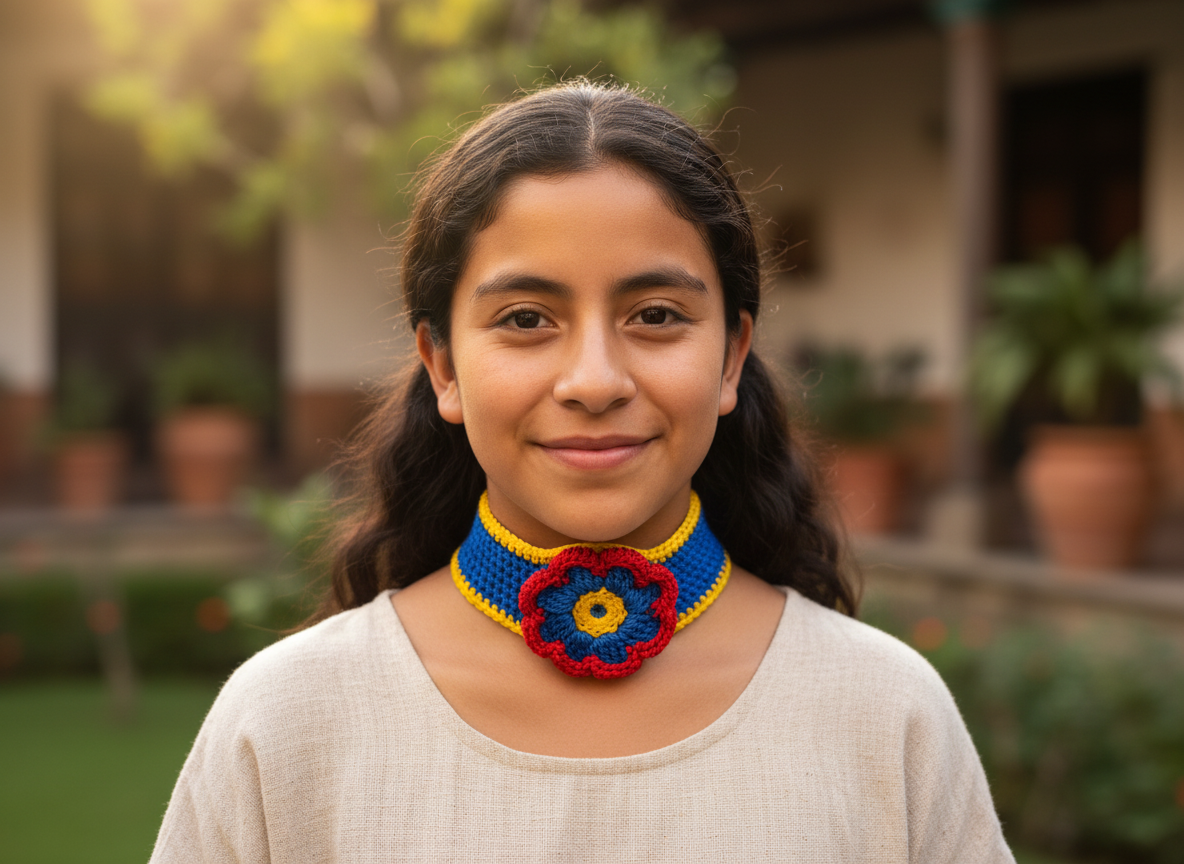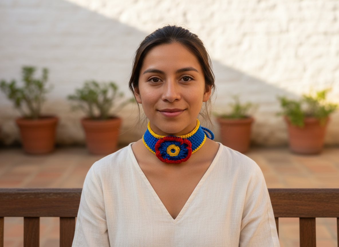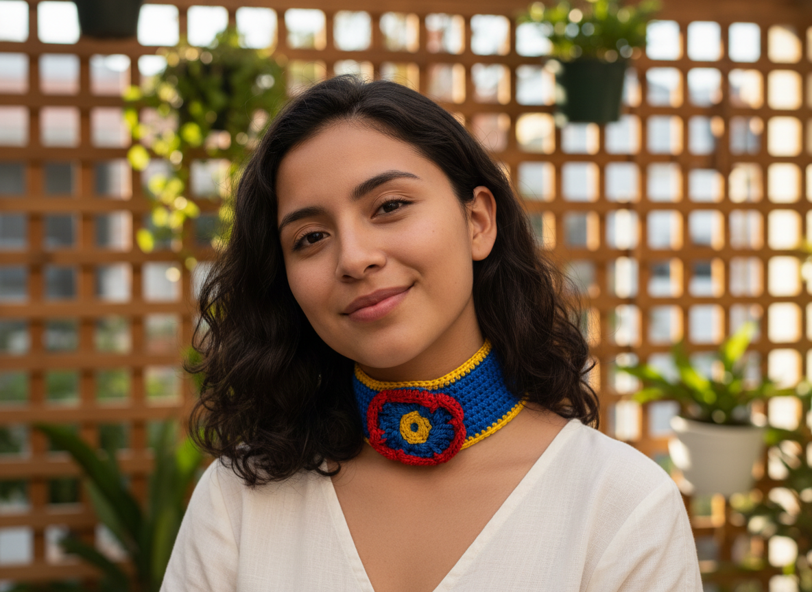 Juego de gargantilla de crochet en azul con borde amarillo y flor azul con centro amarillo y borde rojo. Este diseño artístico destaca por su combinación de colores vibrantes, aportando elegancia y originalidad. La flor central es un encantador punto focal, evidenciando el talento de la artesana. Perfecto para añadir color a cualquier atuendo, este accesorio es ideal para ocasiones especiales o looks casuales, mostrando la versatilidad del crochet.