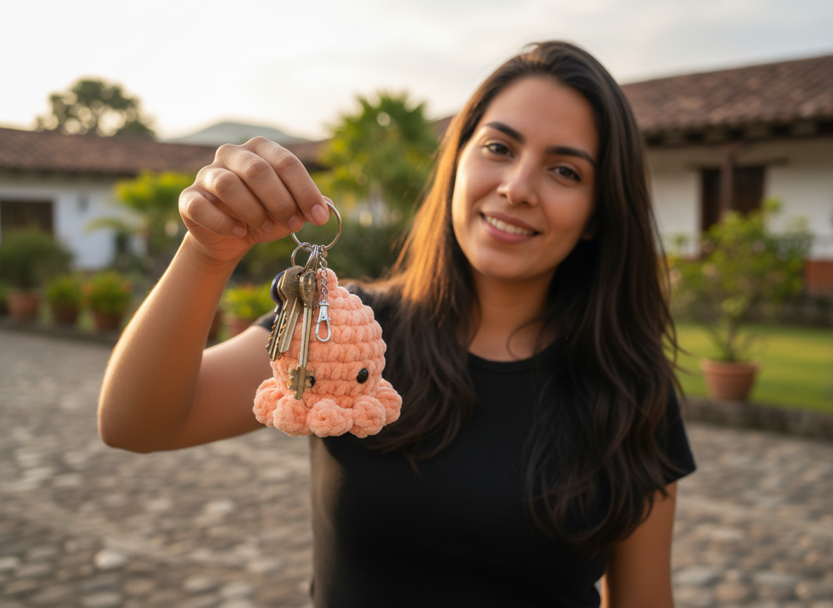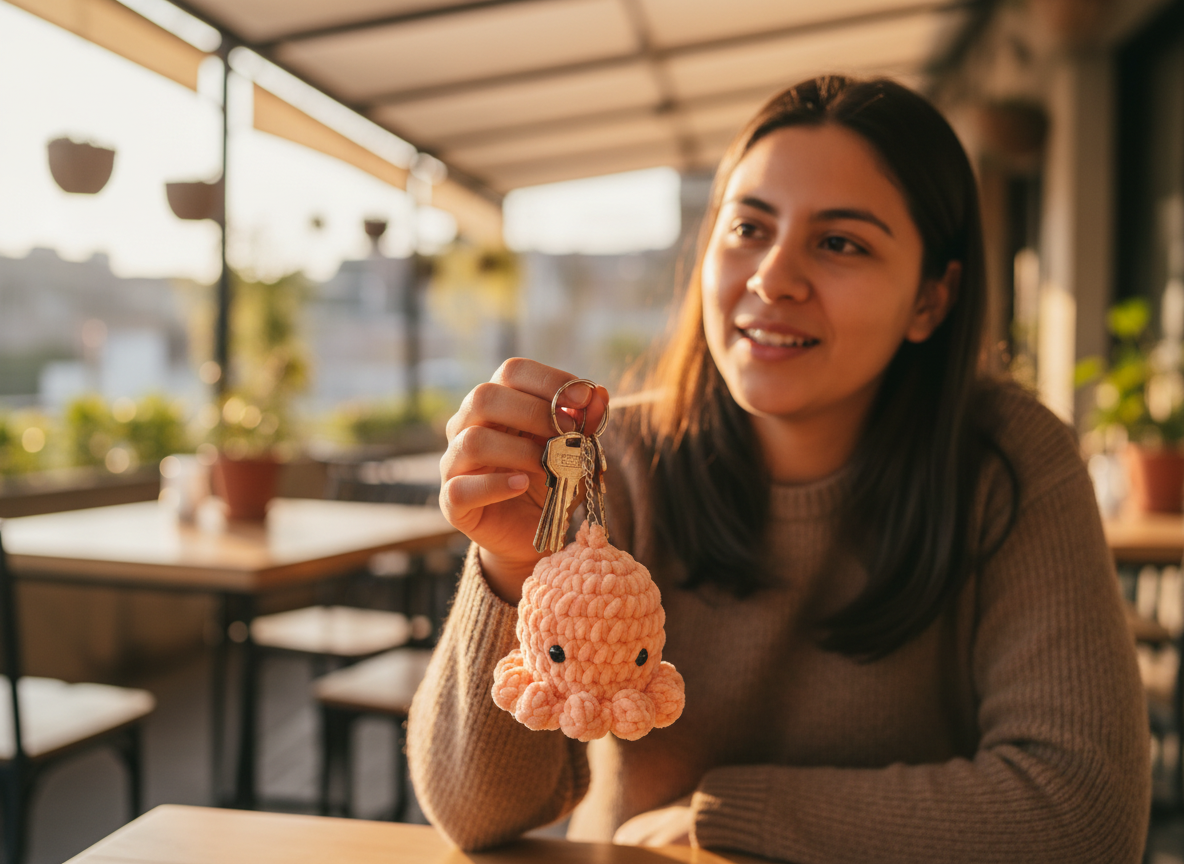Dale un toque alegre a tu día con Medusa Luca, un adorable llavero tejido a mano en suave hilo chenille y un vibrante color melón, que ilumina cualquier bolso, mochila o juego de llaves. con relleno de plumón.