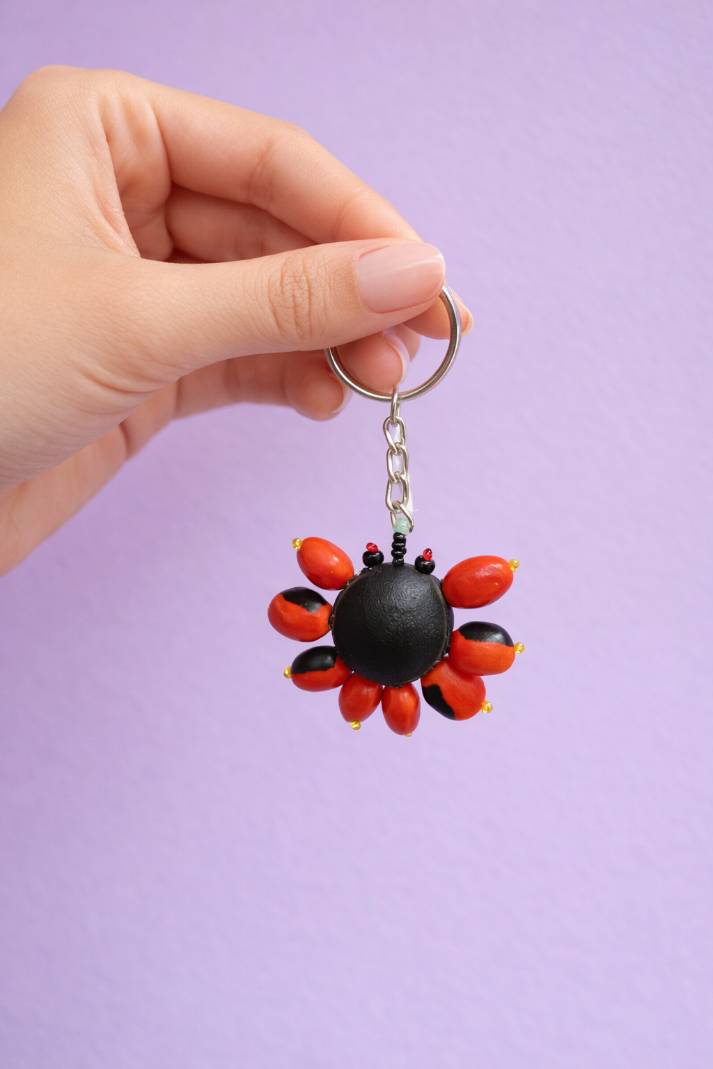 Llavero artesanal elaborado a mano, utilizando semillas naturales de huayruro, tradicionalmente reconocidas como símbolo de protección, buena energía y prosperidad.