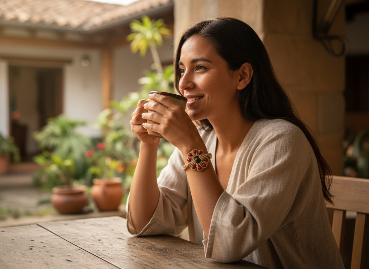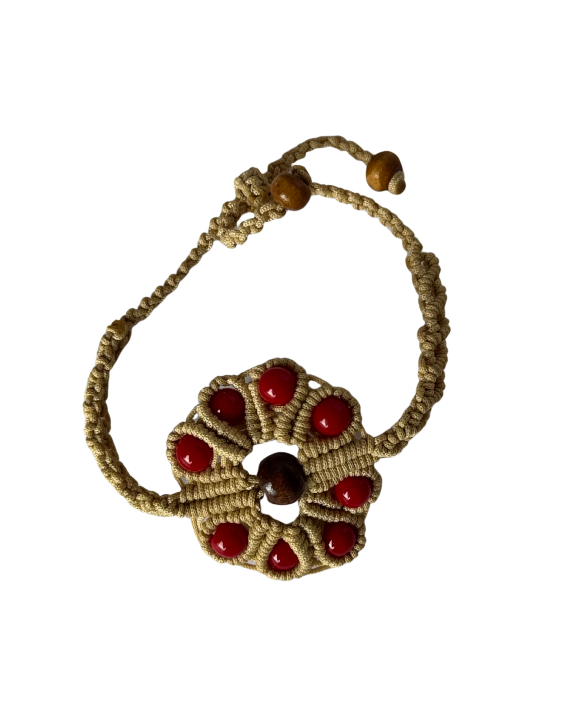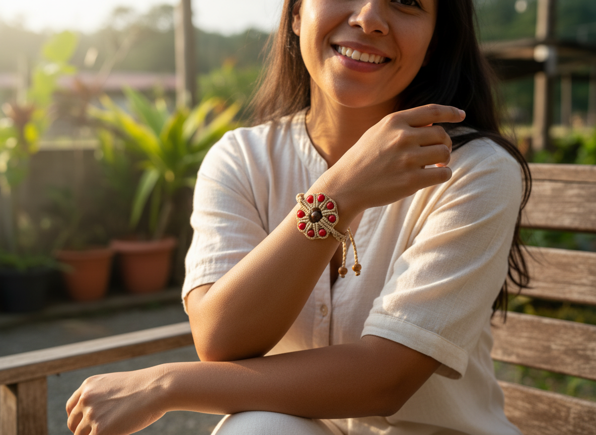 Manilla artesanal tejida en macramé con hilo color marrón, que simboliza la fuerza y la conexión con la tierra. Decorada con perlas rojas que representan pasión y vitalidad, y una perla central de madera café que aporta equilibrio y naturalidad. Su diseño único refleja la armonía entre lo rústico y lo elegante, ideal para quienes buscan llevar consigo un accesorio lleno de energía y estilo.