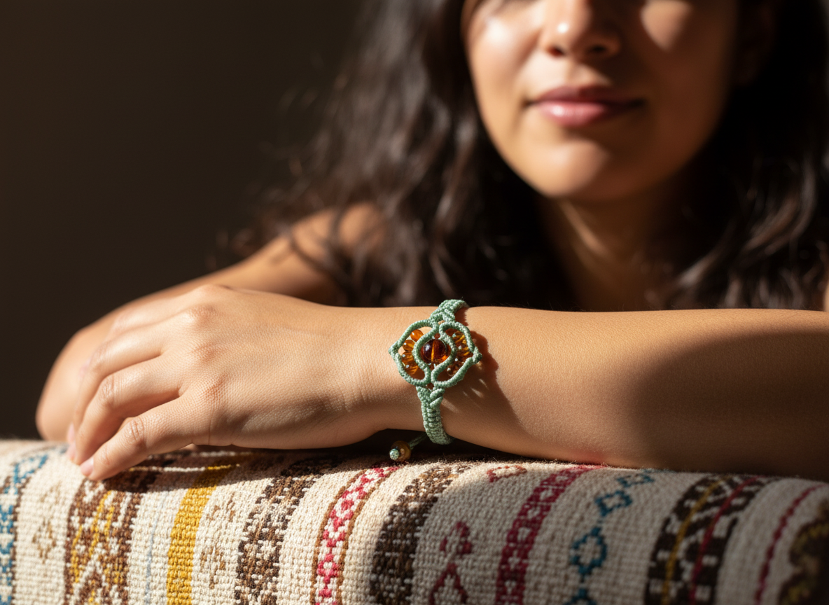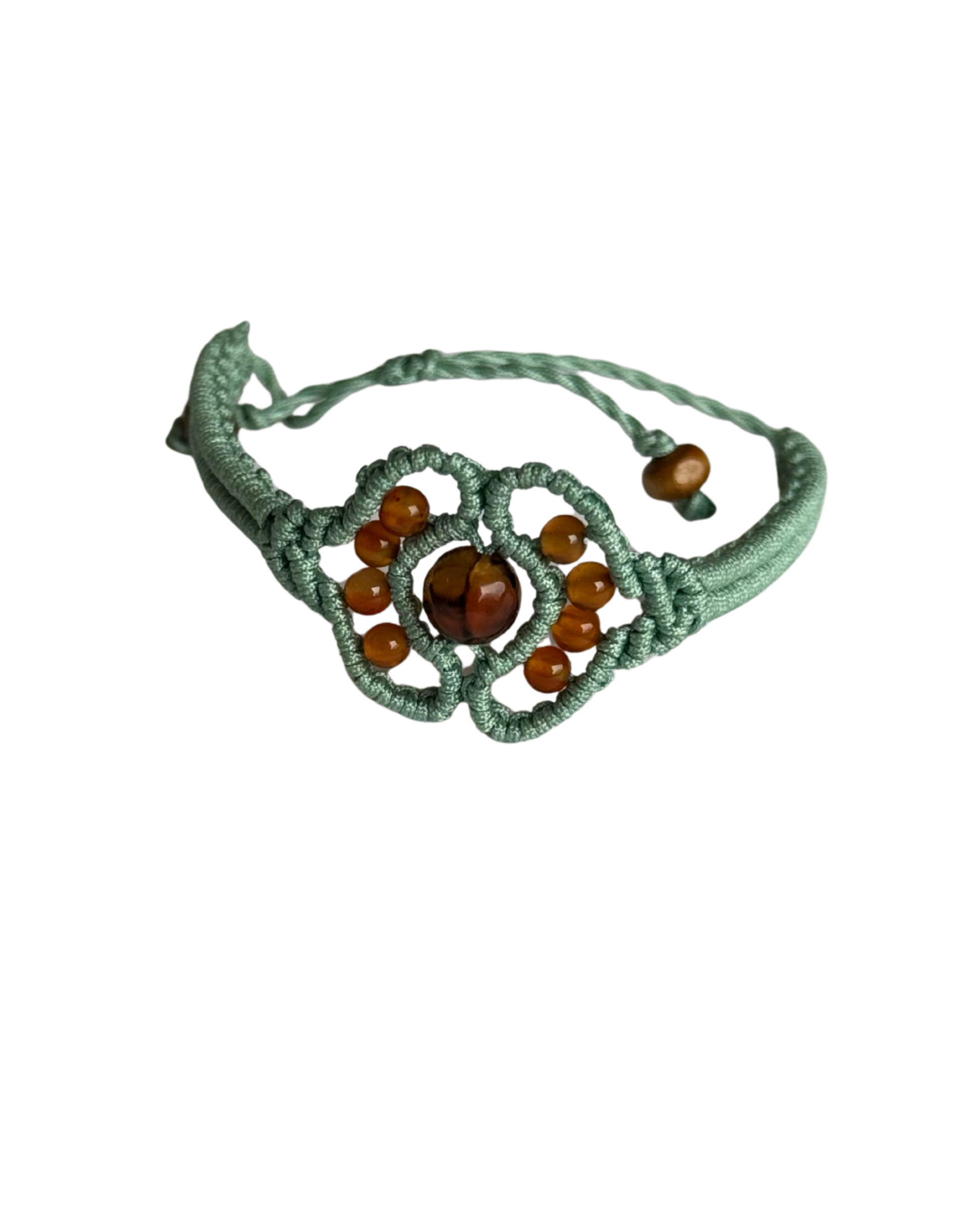 Manilla artesanal en macramé color jade, diseñada con un delicado corazón en el centro que resalta una perlita principal rodeada de pequeñas cuentas. Este accesorio simboliza el amor, la pureza y la conexión con la naturaleza, perfecto para regalar o lucir como un detalle especial lleno de significado y estilo.