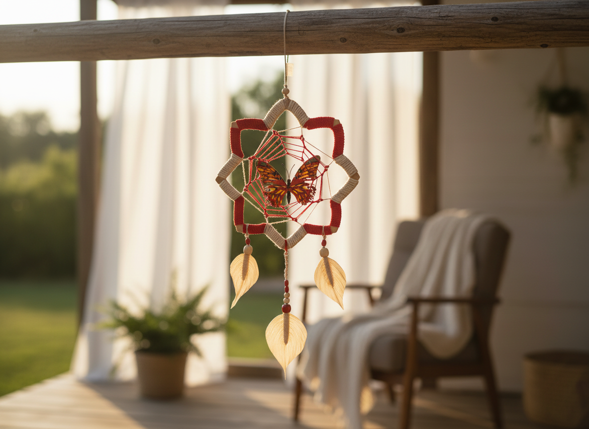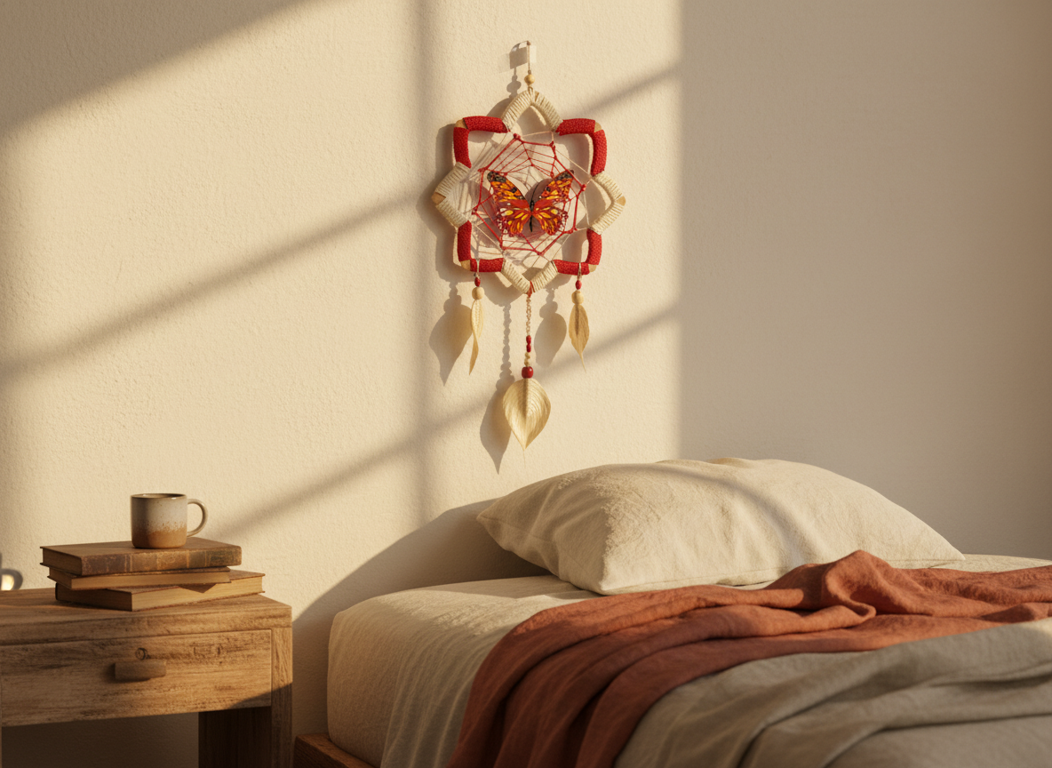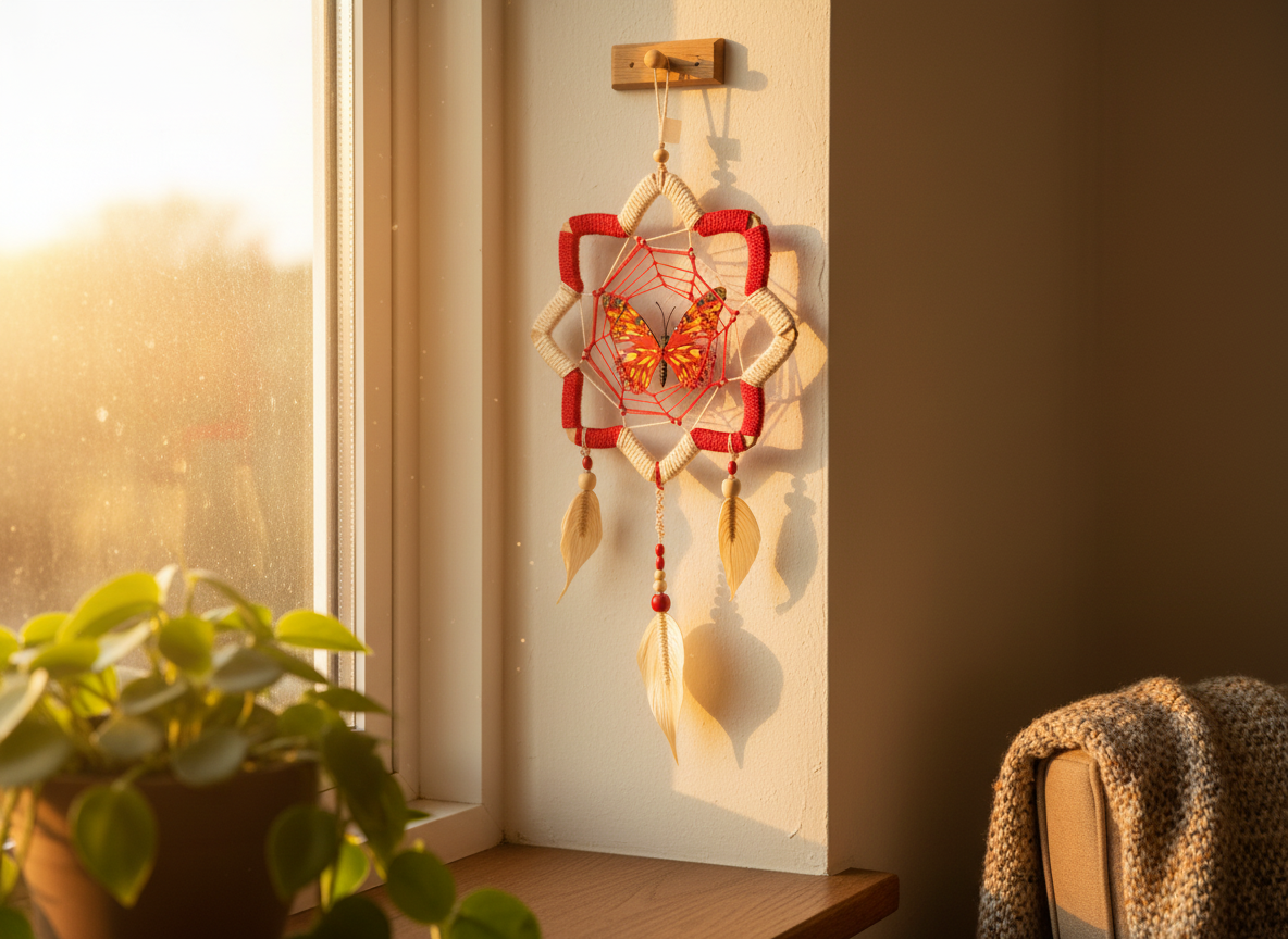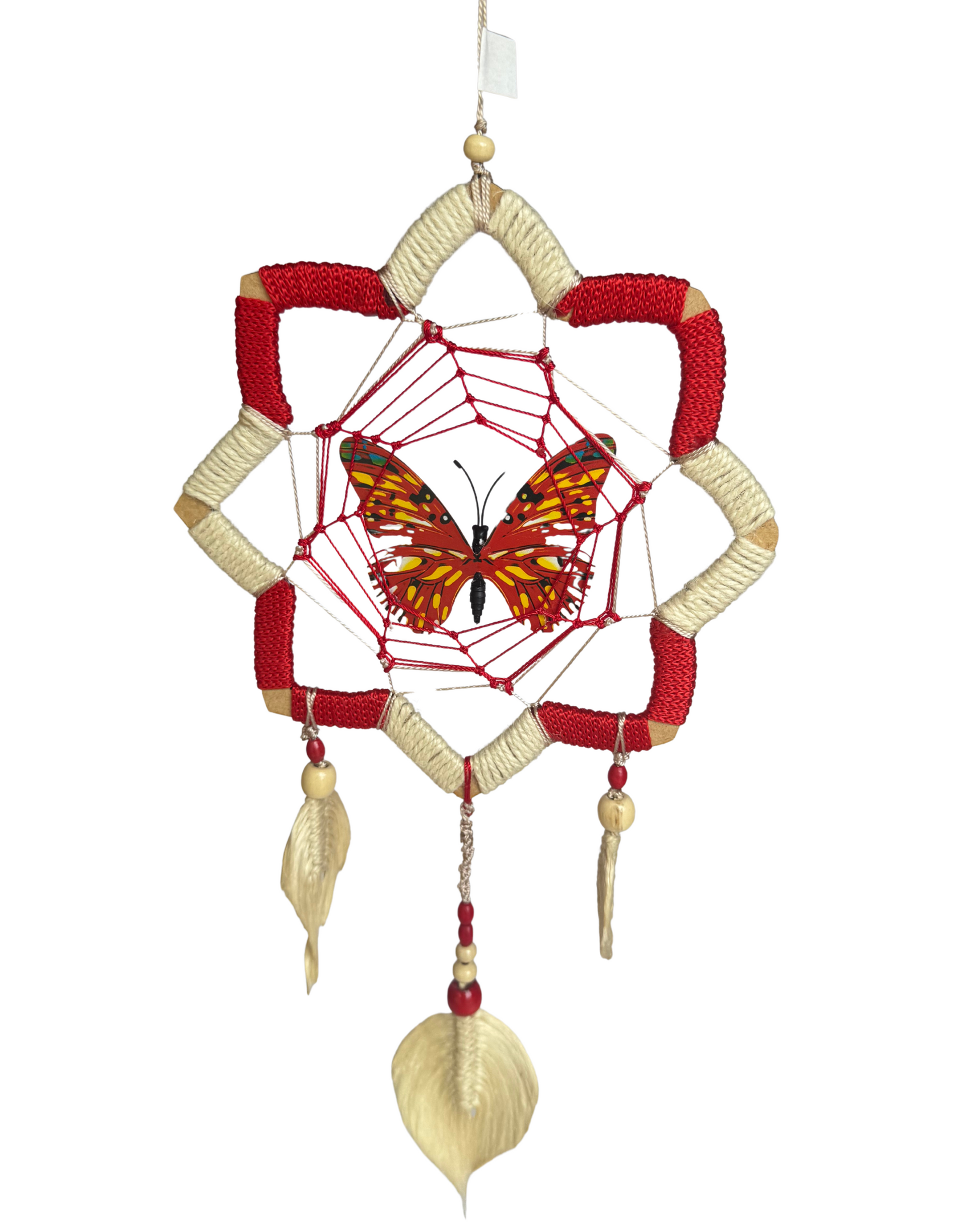 La Mariposa Flor de Loto es una pieza artesanal que refleja la delicadeza y el poder de la naturaleza amazónica. Tejida cuidadosamente en fibra natural de yute en tono blanco crudo y nailon resistente, incorpora plumas artesanales elaboradas en yute con cuentas de madera que realzan su autenticidad.