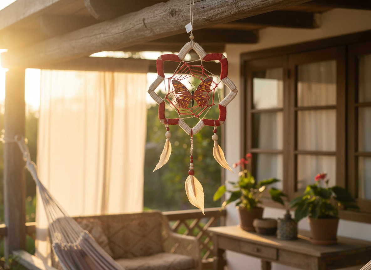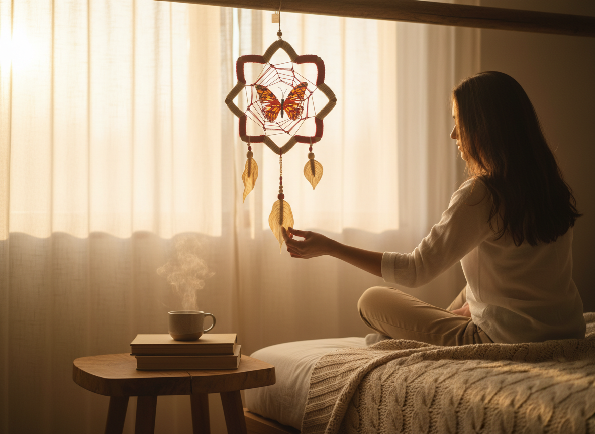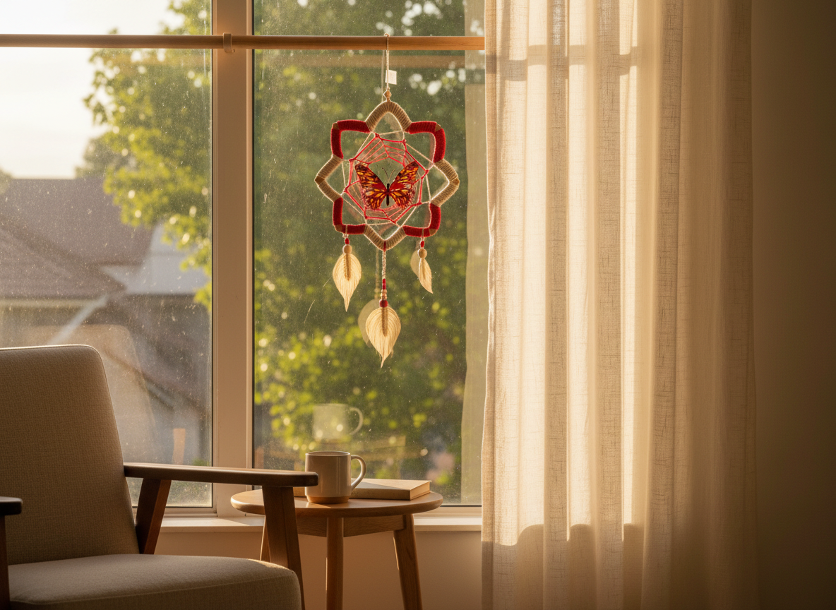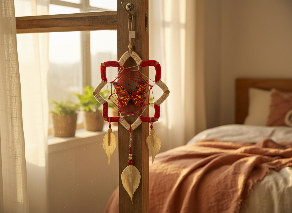 La Mariposa Flor de Loto es una pieza artesanal que refleja la delicadeza y el poder de la naturaleza amazónica. Tejida cuidadosamente en fibra natural de yute en tono blanco crudo y nailon resistente, incorpora plumas artesanales elaboradas en yute con cuentas de madera que realzan su autenticidad.