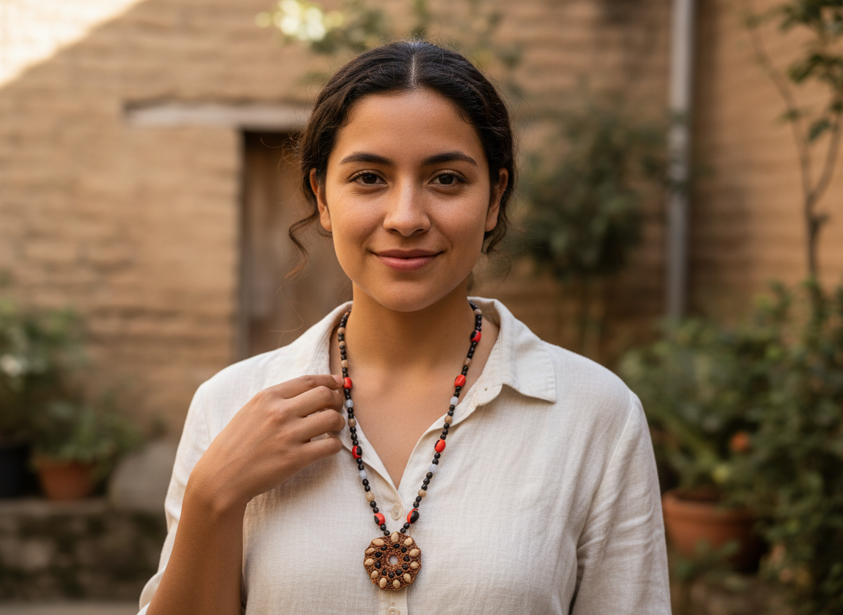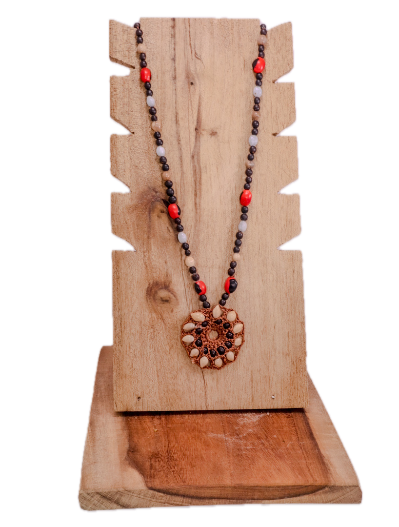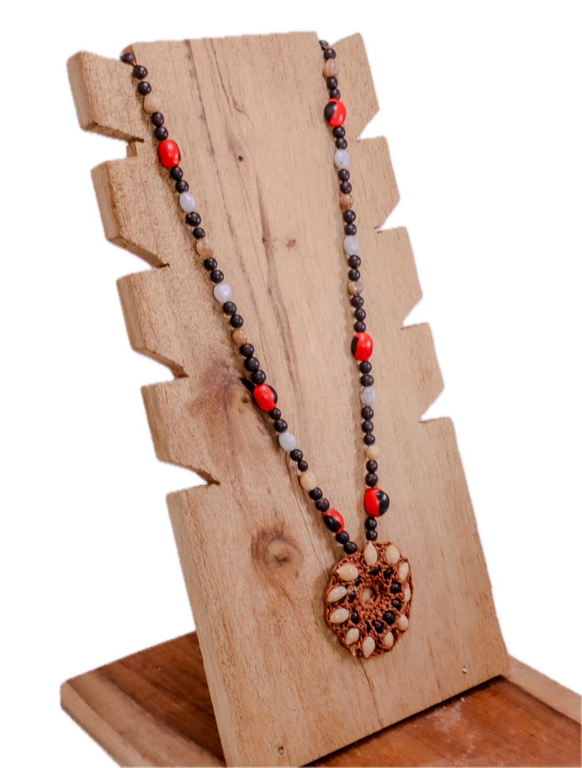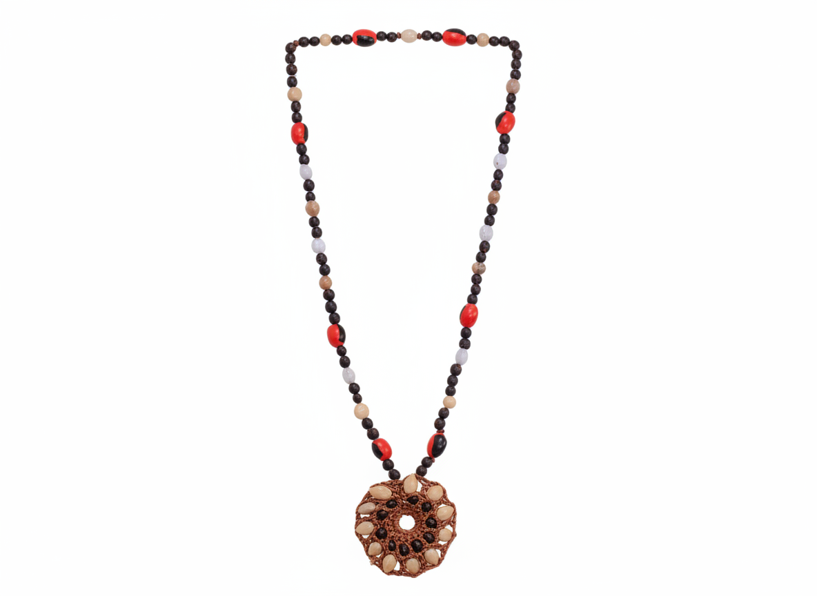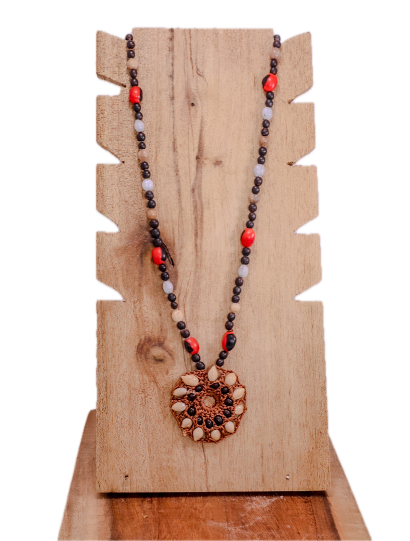 Collar con amuleto central hecho de pepas naturales, con predominancia de colores blanco, negro y café. El diseño recuerda a un tótem protector, canal de equilibrio entre fuerzas opuestas. Perfecto como símbolo de defensa espiritual y arraigo.
