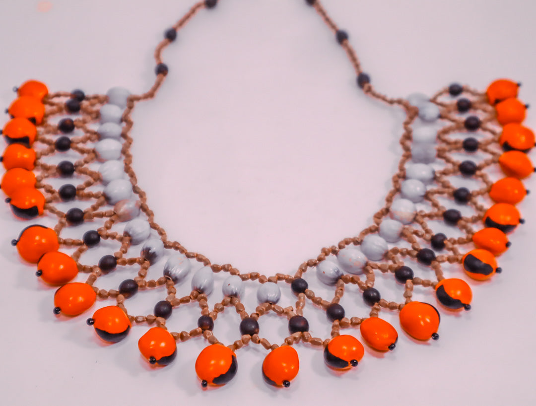 Diseño elaborado con pepas de madera y semillas vegetales, entrelazadas en colores tierra: blanco, negro, café y rojo. Este collar simboliza la unión entre las raíces culturales y la identidad ancestral. Ideal para quienes valoran la sabiduría de la naturaleza.