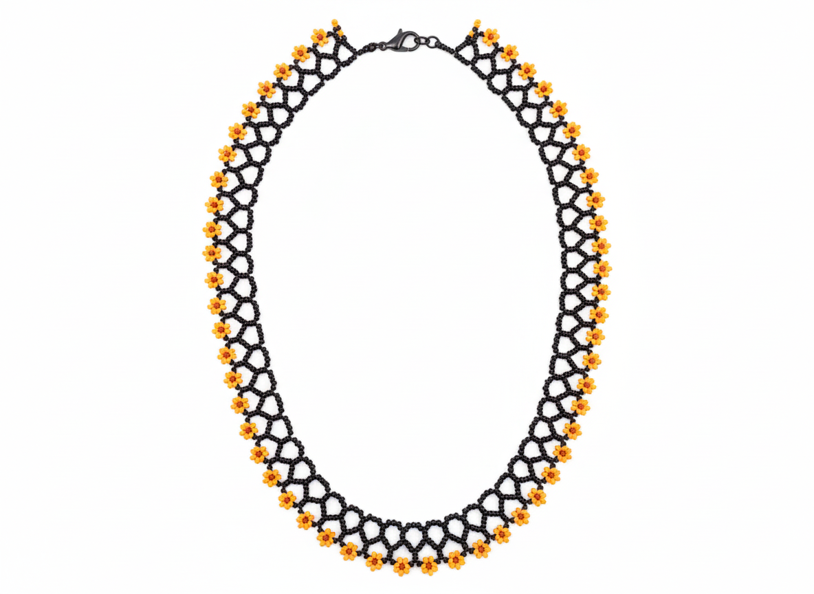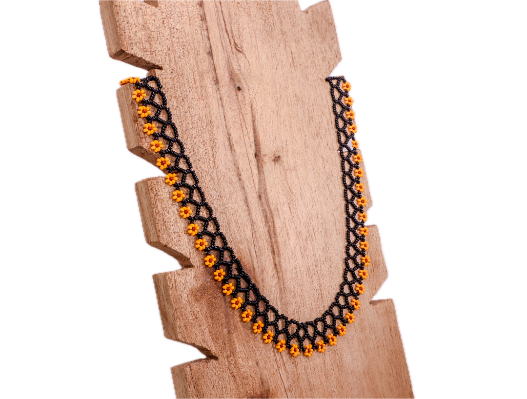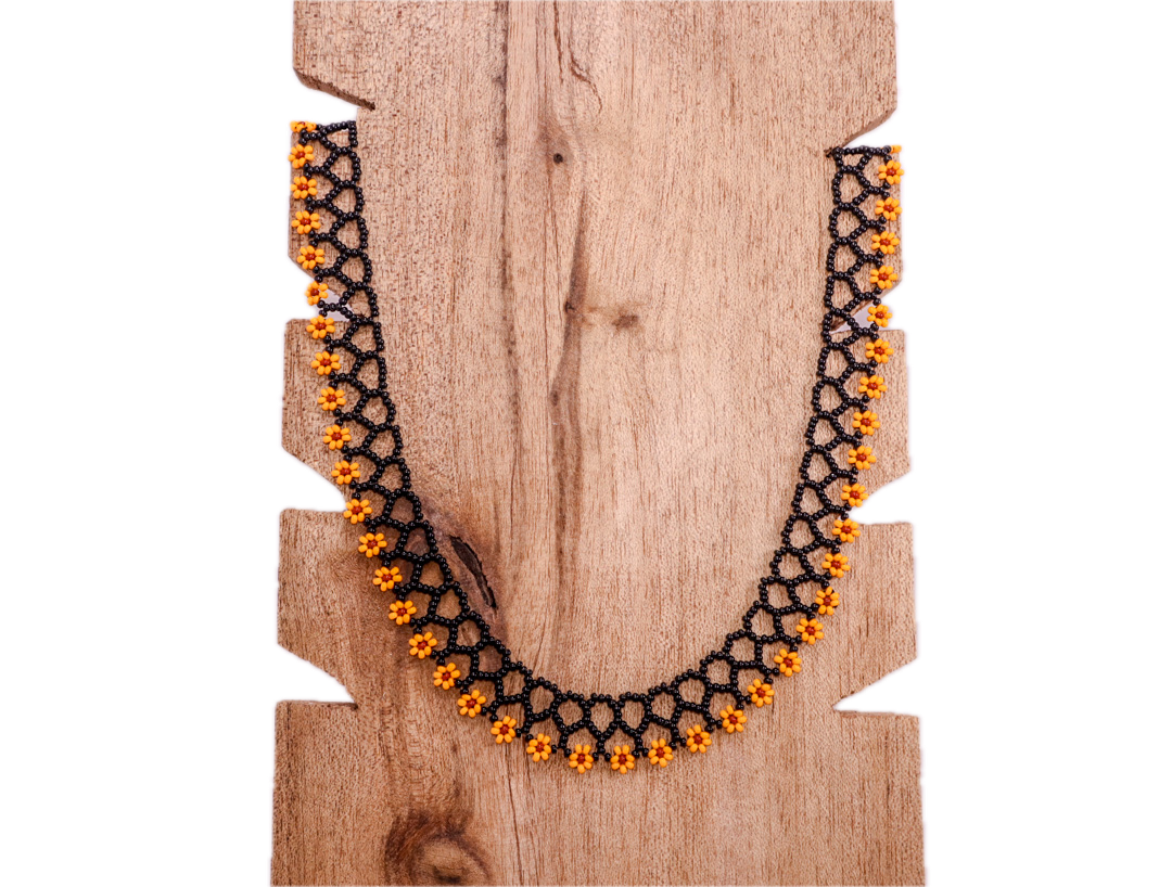 Collar artesanal con flores amarillas en los extremos que evocan el sol naciente. Hecho con pepitas naturales conectadas en patrones triangulares con pepas negras, este diseño simétrico simboliza la armonía y la fuerza de la tierra. Ideal para portar energía vital y alegría.
