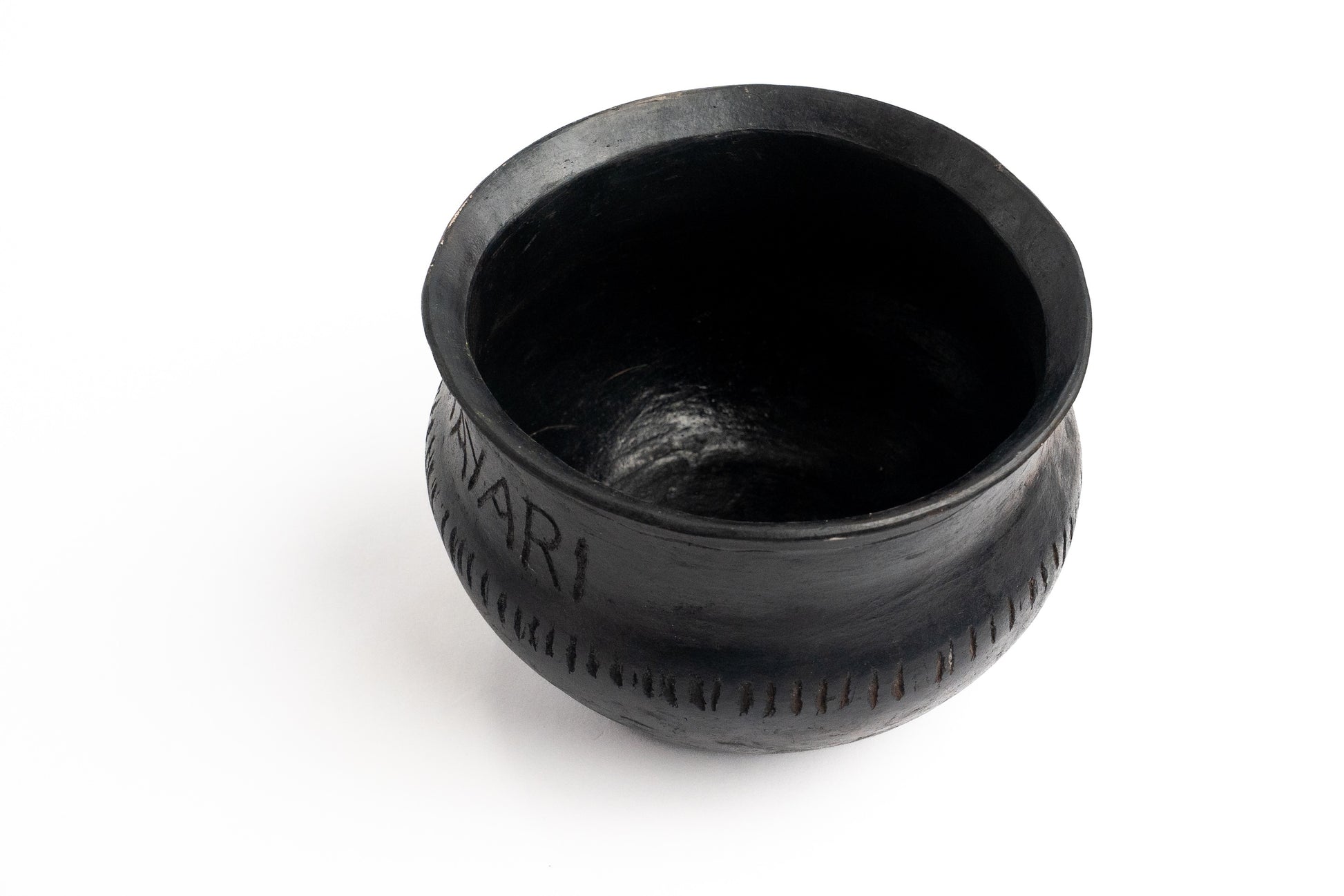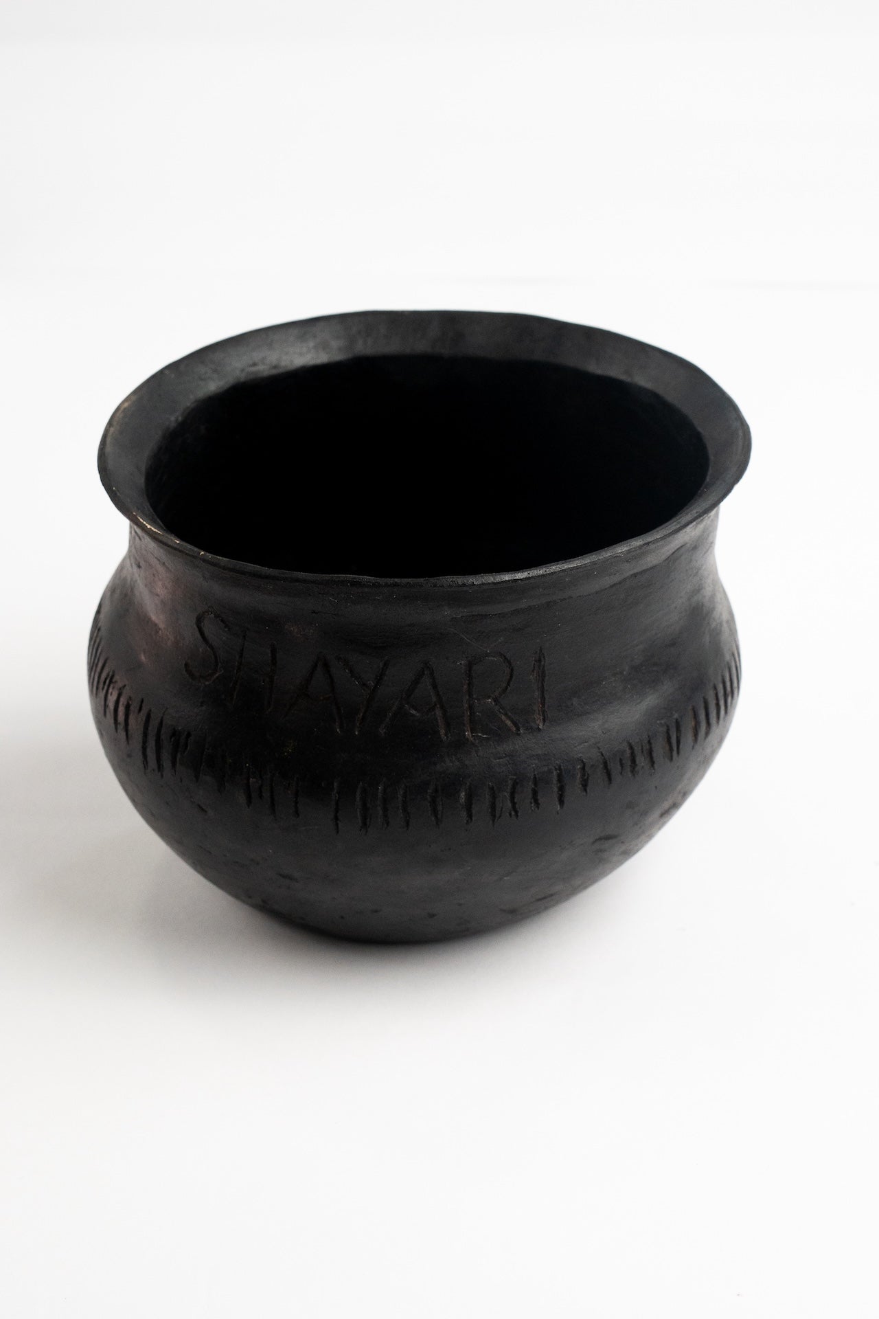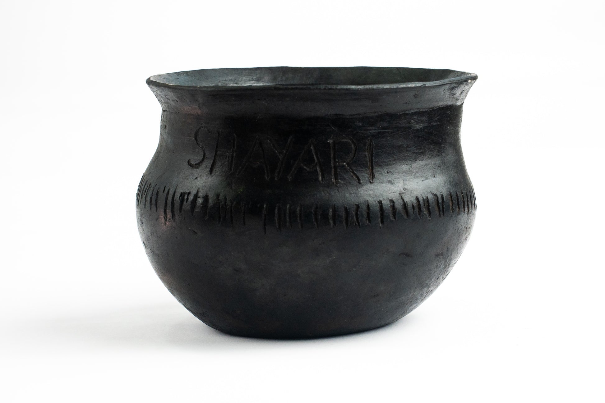 Elegante pieza artesanal de arcilla con técnica ahumada, acabado pulido, inscripción SHAYARI y grabados decorativos. Ideal como elemento decorativo o para uso culinario.